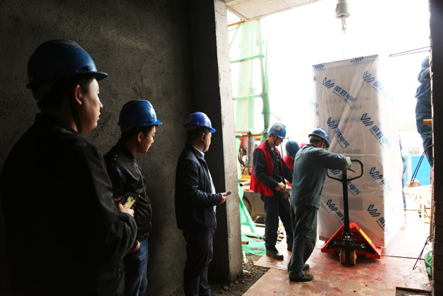 4月3日早上5时30分,天刚蒙蒙亮,第一批16台等待装车的KYN28柜盖上了薄膜,正整整齐齐的等待着装车,这是成套事业部员工们忙活一晚上的成果,这也是他们经过重重检验,可以放心交到客户手中的产品。5时50分,第一辆满载着威胜电气产品的运输车辆驶离厂区,开往湘潭九华北220kV变电站新建工程项目现场,为确保产品顺利交付,付总一行还赶赴现场,在确认了我们的产品在项目上吊装卸货顺利无误才回到厂区。