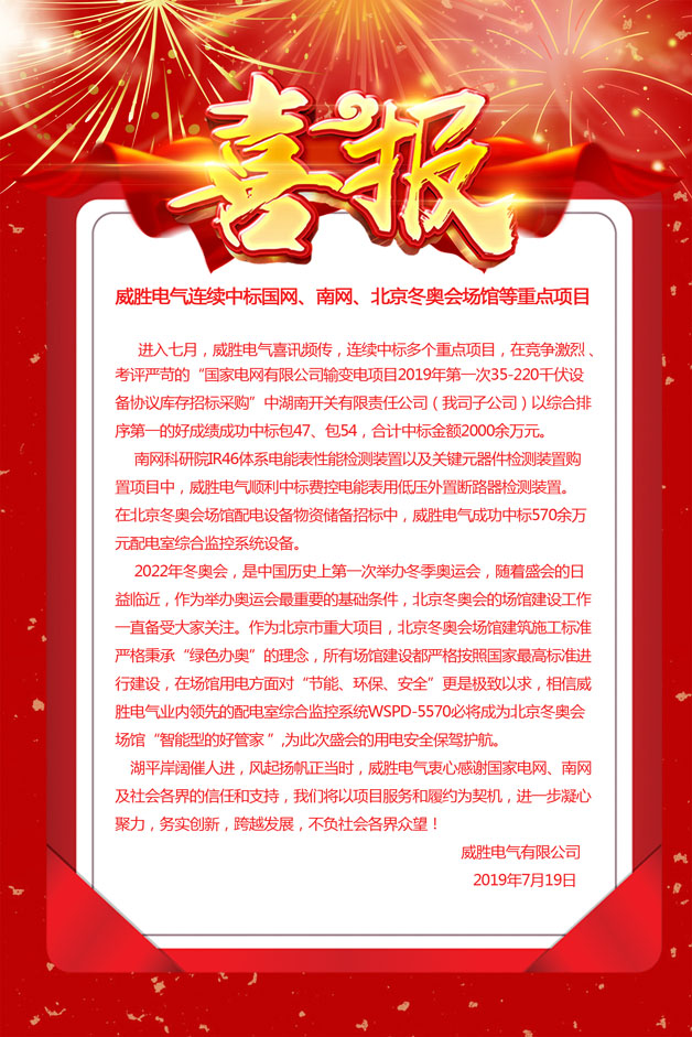 进入七月,威胜电气喜讯频传,连续中标多个重点项目,在竞争激烈 、考评严苛的“国家电网有限公司输变电项目2019年第一次35-220千伏设备协议库存招标采购”中湖南开关有限责任公司(我司子公司)以综合排序第一的好成绩成功中标包47、包54,合计中标金额2000余万元。