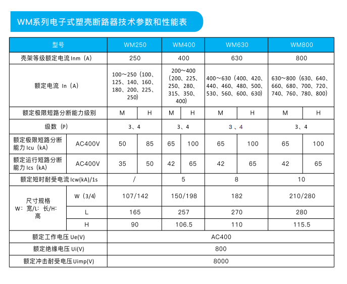 其额定工作电压至690V、额定绝缘电压至800V、额定冲击耐受电压达到BKV、额定工作电流16A-800A。WM系列断路器适用于配电和电动机保护场合,也适用于消防场合。断路器具有过载、短路、欠压保护等功能,能保护线路和电源设备不受损坏。