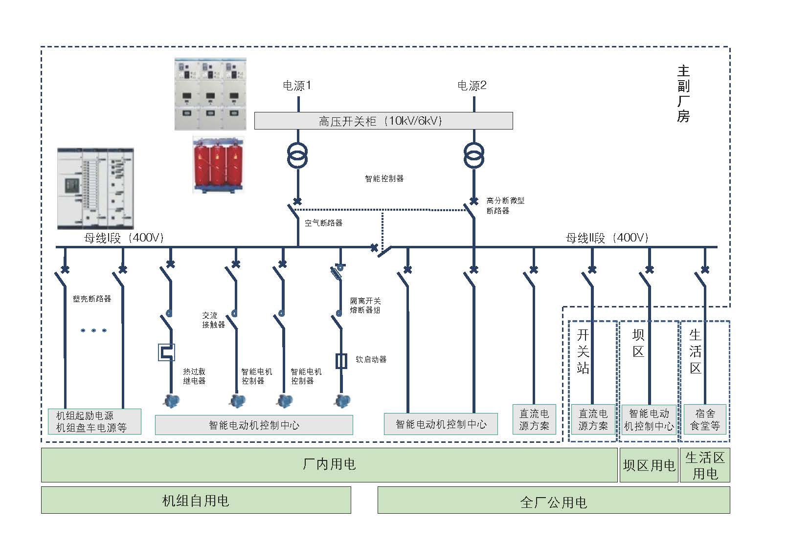 中型水电站装机容量一般为 25MW 小于水电站容量≤ 250MW,厂用电电源采用双层辐射式供电,两级电压分别为 10kV / 6kV、400V 供电,机组自用电和全厂公用电采用混合式供电方式。威胜电气水力发电智能配电解决方案主要设备包含发电机侧6.3KV开关柜,站用10KV开关柜、0.4KV开关柜及其配套相关配电设备。