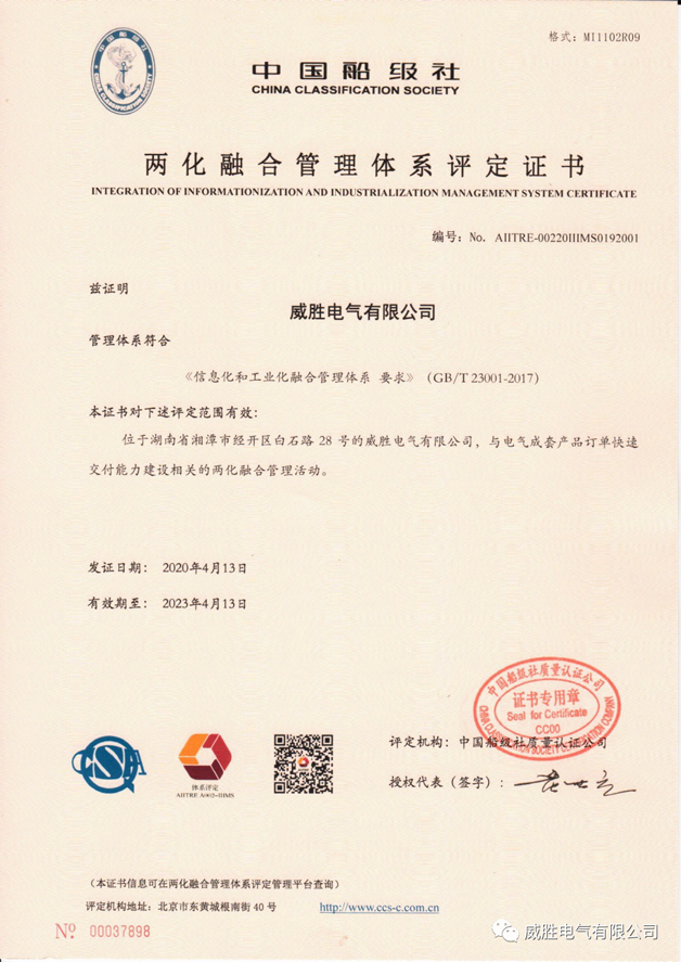 经过中国船级社专家来司评估现场审核工作,最终威胜电气顺利通过两化融合体系评估认证。并于2020年4月13日收到国家工信部签发的两化融合管理体系评定证书。
