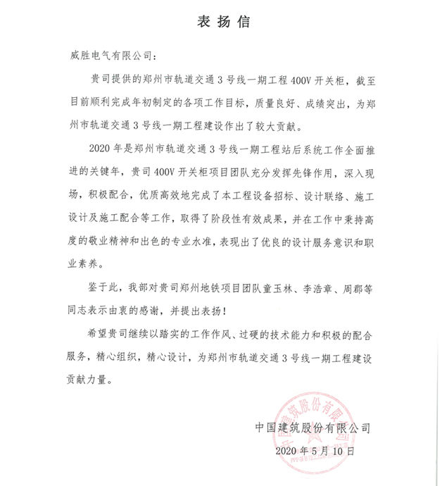 2020年5月10日,威胜电气收到了郑州市轨道交通项目业主方中国建筑股份有限公司发来的表扬信,感谢我司为郑州市轨道交通3号线一期工程建设所做出的较大贡献。