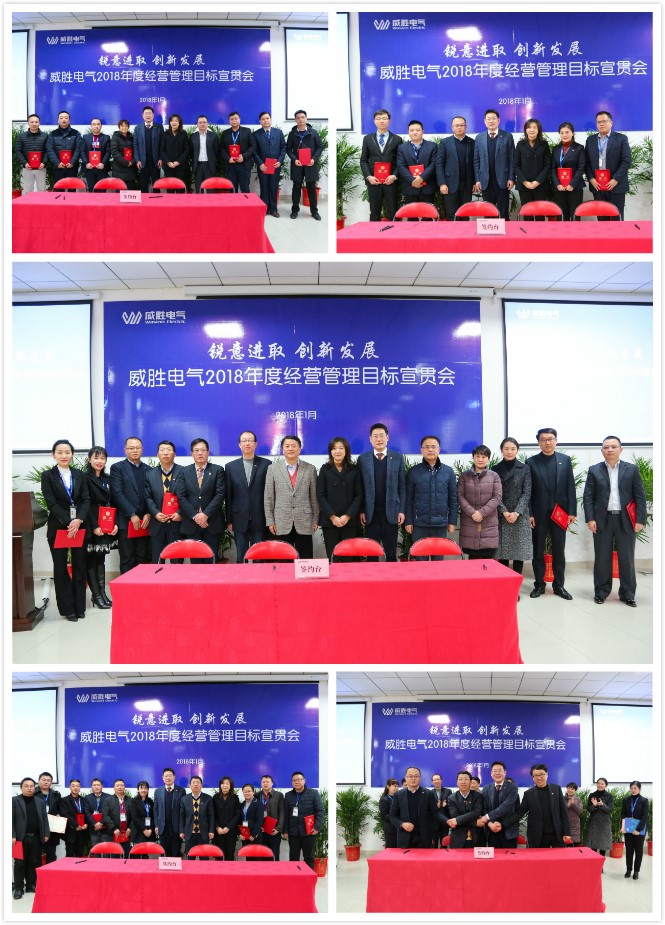 会议第二阶段举行电气2018年经营管理目标签字仪式:首先,电气董事长曹总郑重向控股董事会吉主席签署2018年目标承诺书;随后,威胜电气总裁曾辛先生向电气董事长曹总签署2018年目标承诺书;接着,由电气经营管理团队责任人、销售负责人签2018年目标承诺书。
