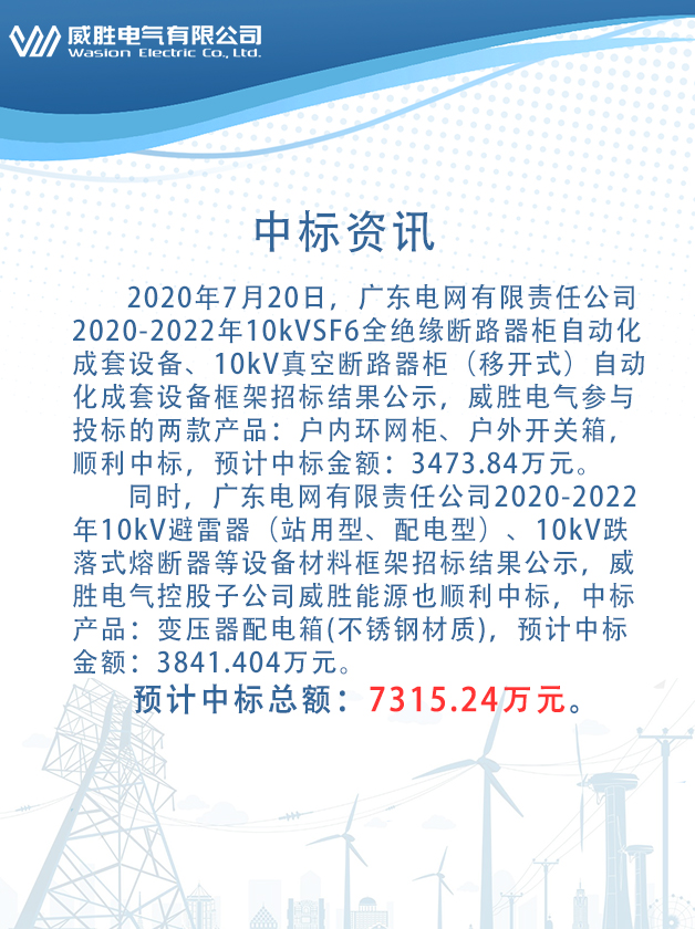 2020年7月20日,广东电网有限责任公司2020-2022年10kVSF6全绝缘断路器柜自动化成套设备、10kV真空断路器柜(移开式)自动化成套设备框架招标结果公示,威胜电气参与投标的两款产品:户内环网柜、户外开关箱顺利中标,预计中标金额:3473.84万元。同时,广东电网有限责任公司20202022年10kV避雷器(站用型、配电型)、10kV跌落式熔断器等设备材料框架招标结果公示,威胜电气控股子公司66体育直播平台 也顺利中标,中标产品:变压器配电箱(不锈钢材质),预计中标金额:3841.404万元。预计中标总额:7315.24万元
