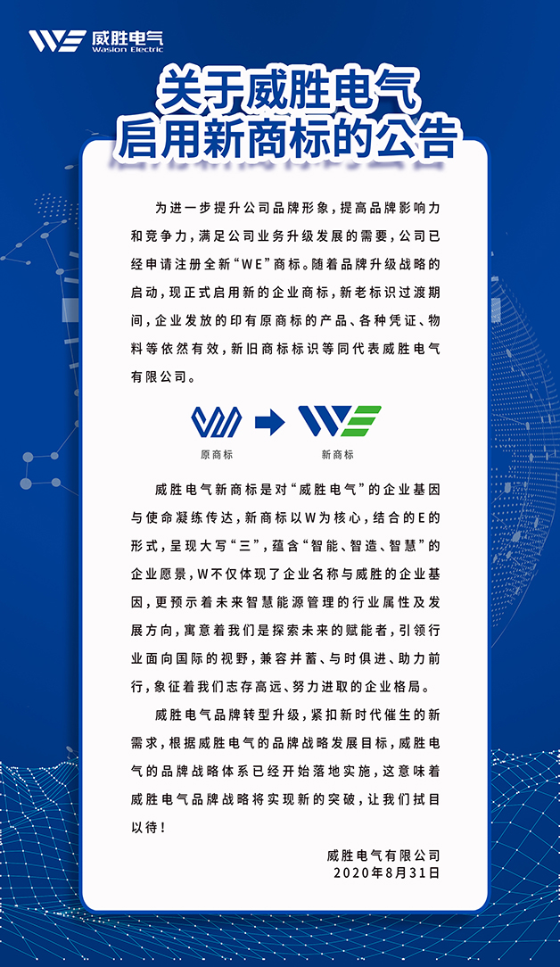 为进一步提升公司品牌形象,提高品牌影响力和竞争力,满足公司业务升级发展的需要,公司已经申请注册全新“WE”商标。随着品牌升级战略的启动,现正式启用新的企业商标,新老标识过渡期间,企业发放的印有原商标的产品、各种凭证、物料等依然有效,新旧商标标识等同代表威胜电气有限公司。