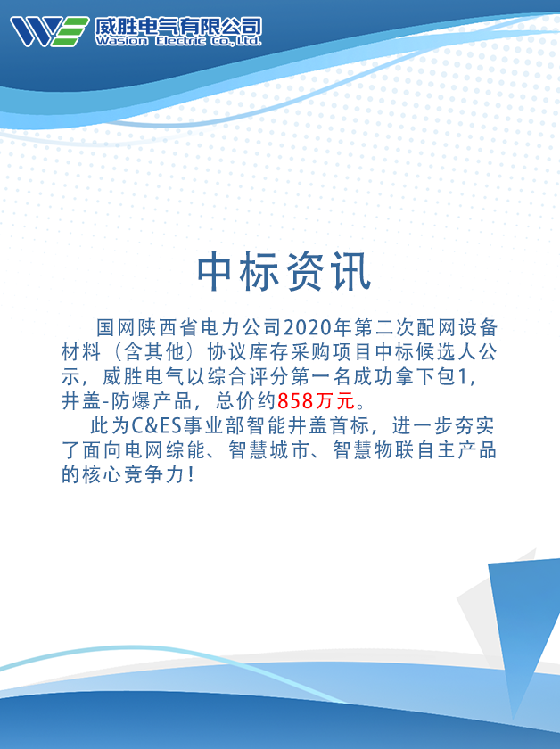 国网陕西省电力公司2020年第二次配网设备材料(含其他)协议库存采购项目中标候选人公示,威胜电气以综合评分第一名成功拿下包1,井盖-防爆产品,总价约858万元。