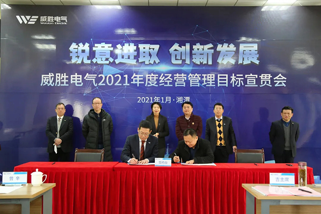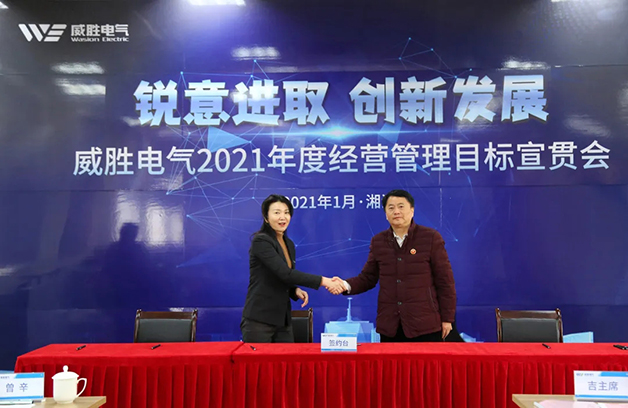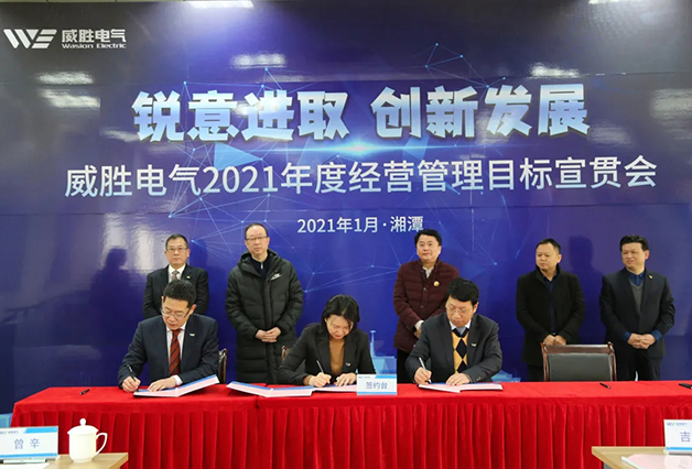 邓超艳女士宣读了2021年威胜电气核心经营管理团队和核心中层干部的人事任命。在控股董事会及各位领导同仁的共同见证下,电气董事长、总裁及核心经营管理团队及核心中层干部正式签署了2021年度经营目标任务书。