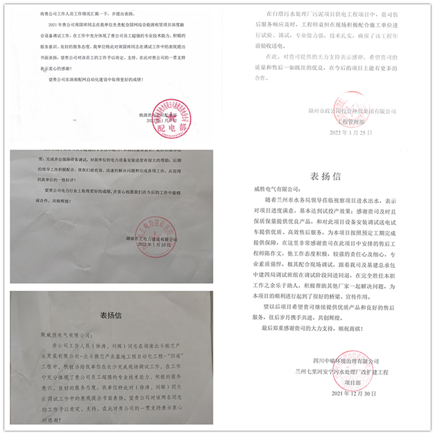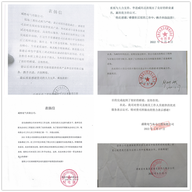 2022年1-3月,威胜电气收到湖南星电集团、盛隆电力、湖南名正电力、桃源供电公司、赣州市政公用投资控股集团、重庆恩捷新材料、中蓝长工比亚迪项目等电网重点工程、省市重点项目客户的十余份表扬信。感谢信中既有强调我司项目人员超强的专业技术能力,确保了项目在各种客观因素限制下,依然确保了项目提前验收通电;也有高度肯定我司项目人员工作态度积极,具有超强的责任心和服务意识和态度,与调试班组同进同退,为项目的顺利进行起到了很好的桥梁和示范作用。