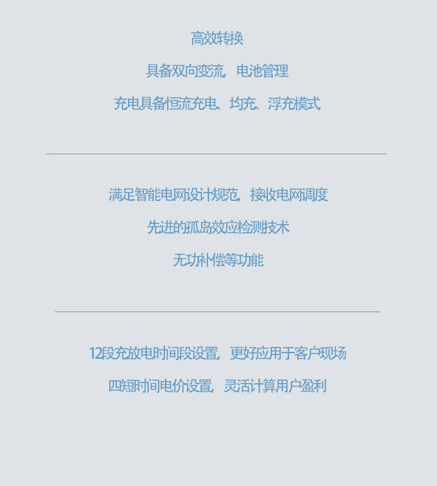 高效转换、具备双向变流,电池管理、充电具备恒流充电、均充、浮充模式