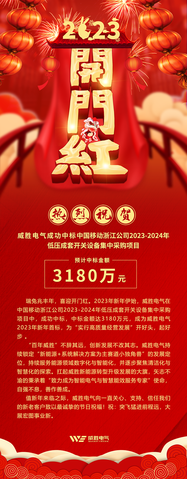 瑞兔兆丰年,喜迎开门红。2023年新年伊始,威胜电气在中国移动浙江公司2023-2024年低压成套开关设备集中采购项目中,成功中标,中标金额达3180万元,成为威胜电气2023年新年首标,为“实行高质量经营发展”开好头,起好步 。