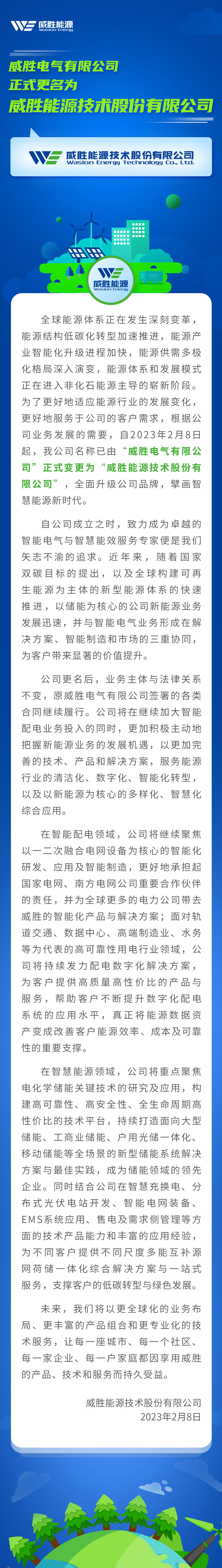 公司更名后,业务主体与法律关系不变,原威胜电气有限公司签署的各类合同继续履行。公司将在继续加大智能配电业务投入的同时,更加积极主动地把握新能源业务的发展机遇,以更加完善的技术、产品和解决方案,服务能源行业的清洁化、数字化、智能化转型,以及以新能源为核心的多样化、智慧化综合应用。