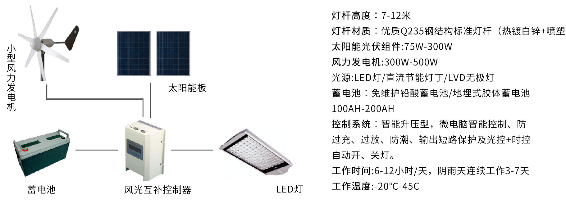 4、照明系统:照明灯具以低压24V灯具为主,如节能灯、无极灯、LED灯、金卤灯等,这些灯具的不同组合的亮度可以达到普通高压灯具照明的效果。灯具的照度、高度等一系列参数符合路灯的标准,灯具功率大小、风力发电功率、太阳能发电功率匹配协调,较大程度适应应用地的风力资源及太阳能资源条件,且安全无触电危险。