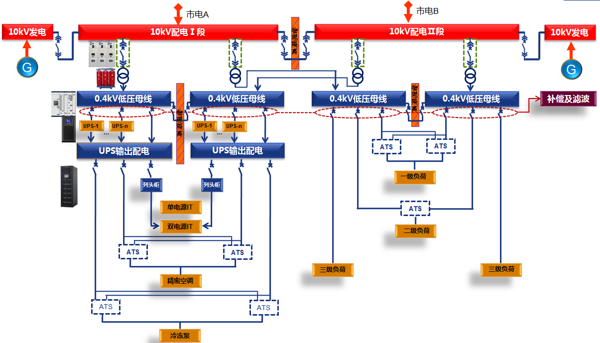配电系统电在一路供电完全故障的情况下,另一路配电系统完全不受影响,进而大大确保了数据中心供电的连续性气设备在电气及物理上的隔离设计方案,大大提升了数据中心对A级机房故障容错的要求,减少故障范围。