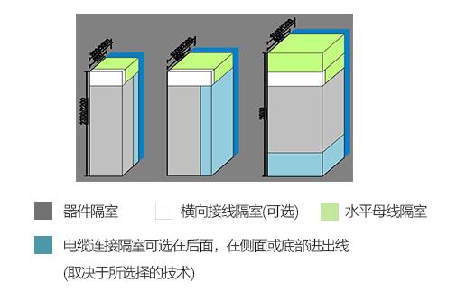 对水平母线系统提出的各种要求,需要用不同的实施可能性给予满足。提供的模块,能做至结构经济性,又能实现运行的高度安全性。水平母线布置在柜的上方。